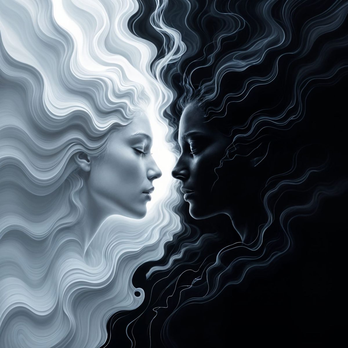 This image showcases a battle between darkness and light, depicted with swirling energy and smoke. The maximalist style creates a hyperdetailed contrast between the black shadows and blinding light.