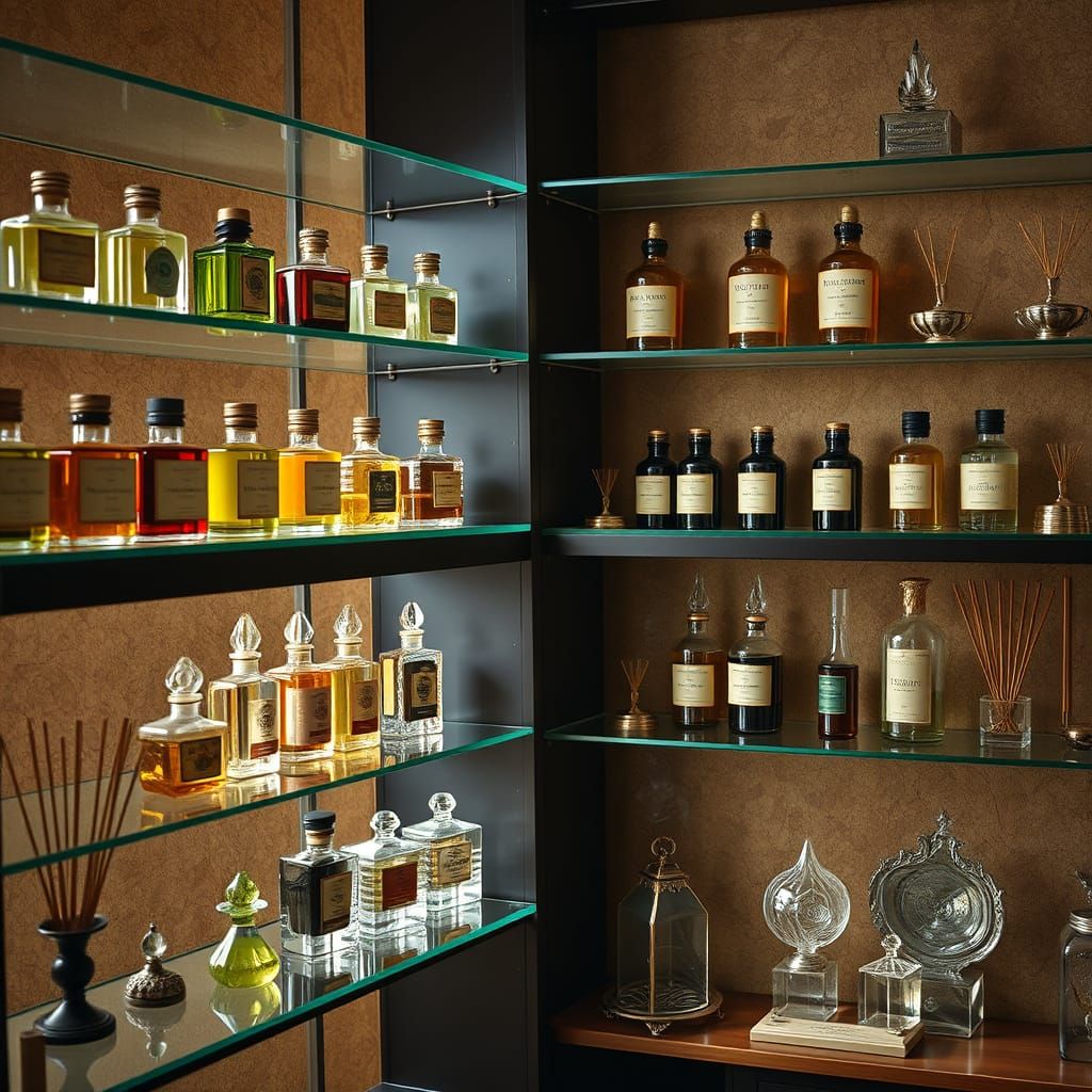 A hyper-realistic still life image of an oils and incense store interior. The scene features glass shelves displaying bottles and incense holders, bathed in soft, natural light with warm, earthy tones.