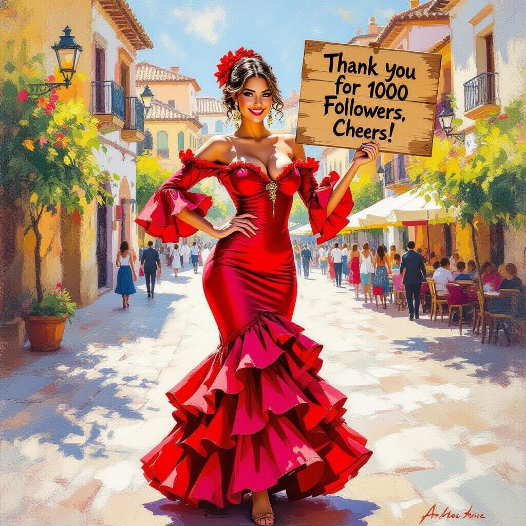 This image depicts a voluptuous Spanish woman in a flamenco dress holding a "thank you" sign. Rendered in a lively, impressionistic oil painting style, it features rich textures and warm colors.