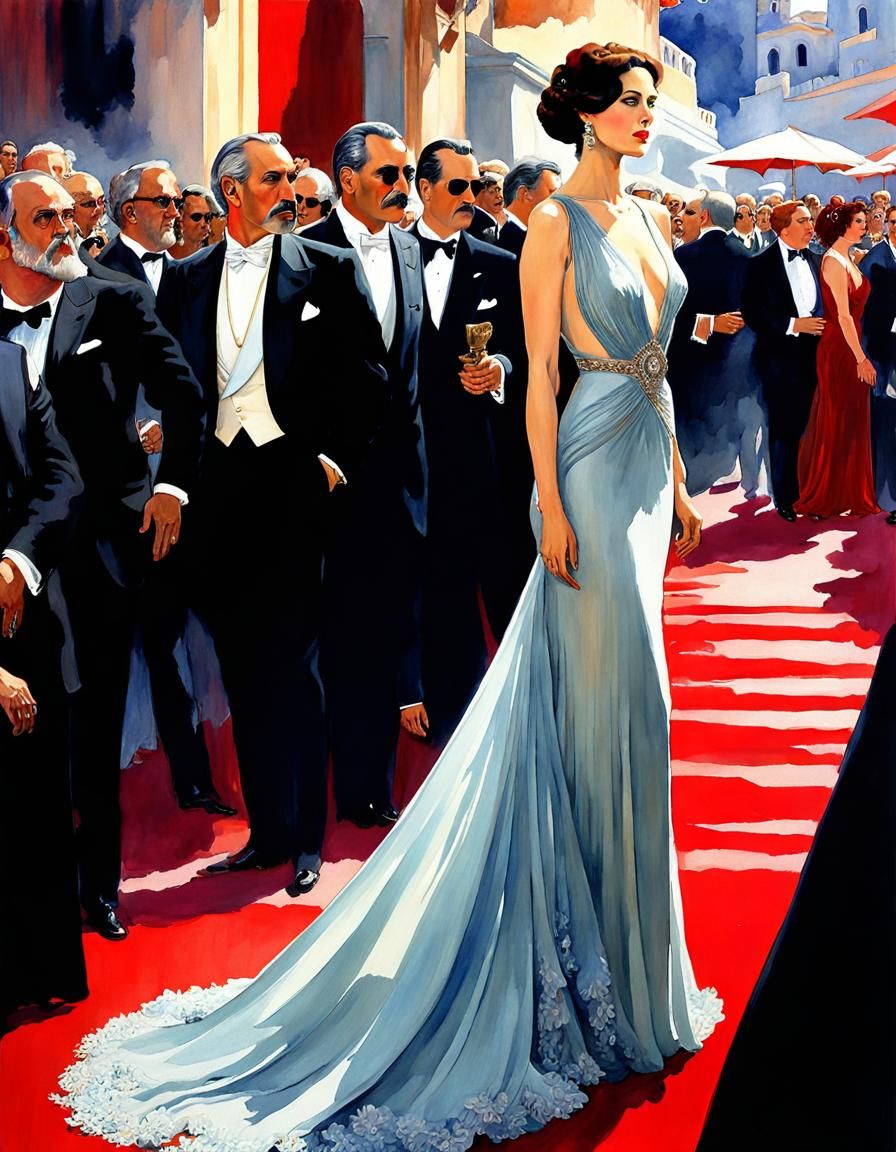A beautiful woman stands on a red carpet amid a crowd. This image is a digital illustration with art deco and romantic fantasy elements, rendered with deep colors in a hyperdetailed watercolor style.