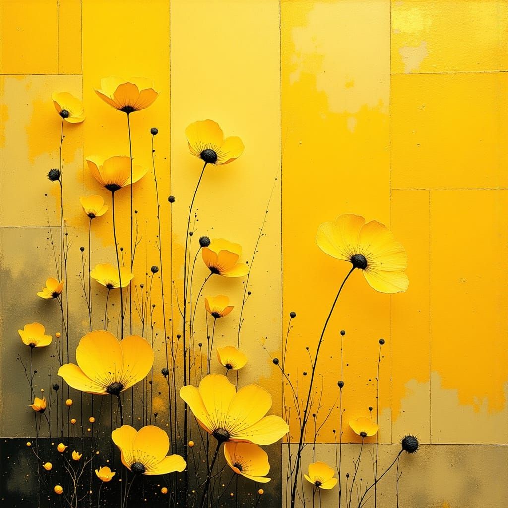 This abstract artwork features delicate yellow flowers with clean lines, rendered in a cubist style with geometric forms and a yellow-gold palette. Dynamic light highlights the composition.