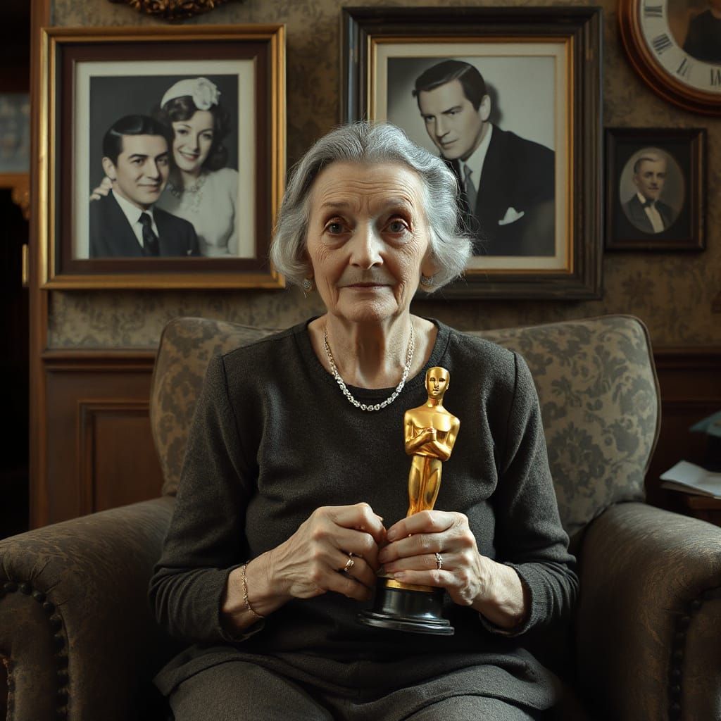 This poignant image captures a nostalgic moment of a frail elderly woman, surrounded by opulent decor, cradling a golden Oscar statuette. Her eyes seem lost in thought, gazing into the past, as the atmosphere exudes a sense of melancholy and the transience of fame.