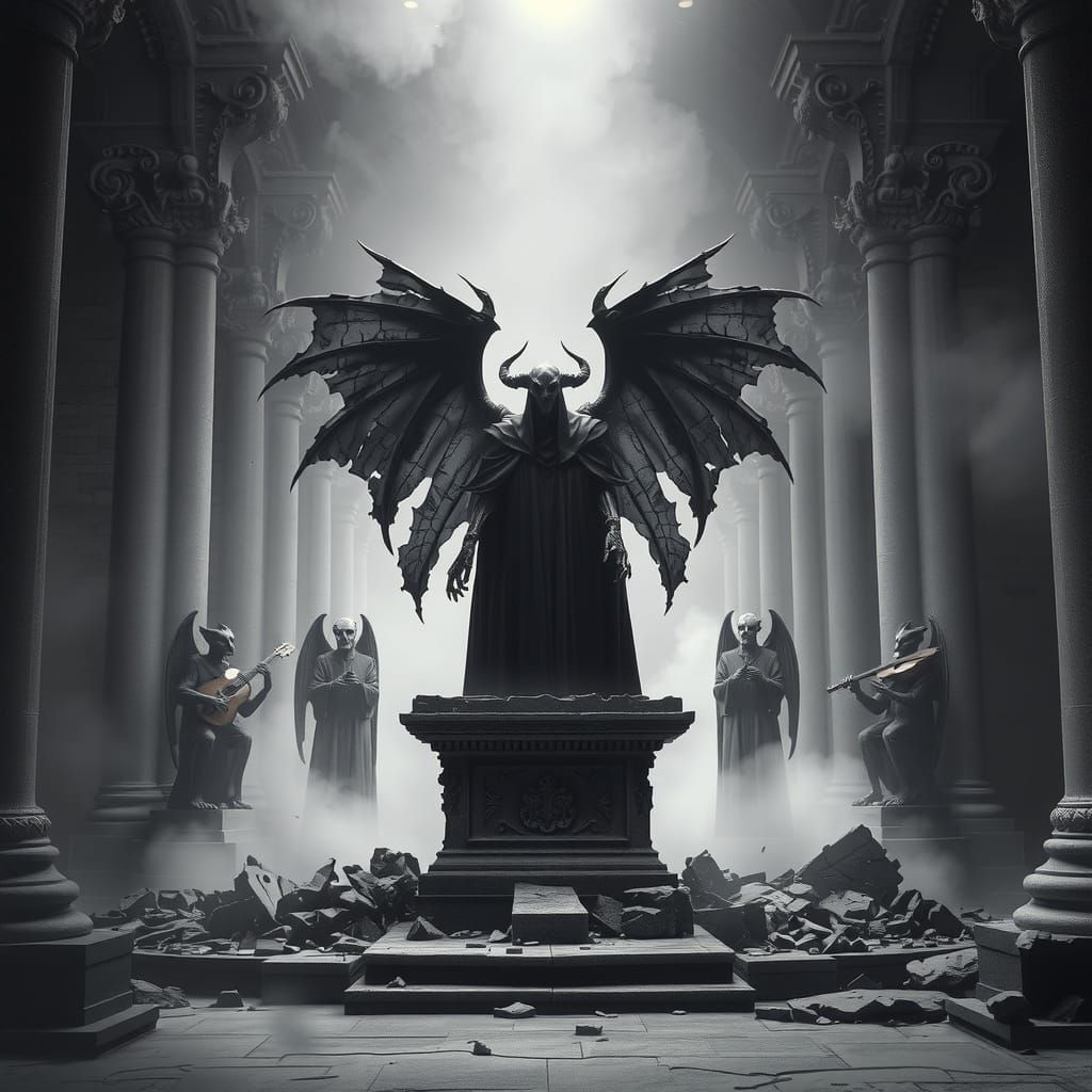 A hyperrealistic image of a spectral figure leading a demonic orchestra in a vast, ruined hall filled with dust and shadow. Features photographic depth and luminous details.