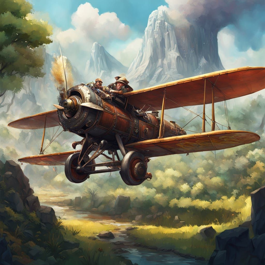 A detailed matte painting of a grizzled bear in aviator gear piloting a sputtering, steam-powered biplane. The artwork features intricate brass mechanics and deep, complementary colors, trending on Artstation.