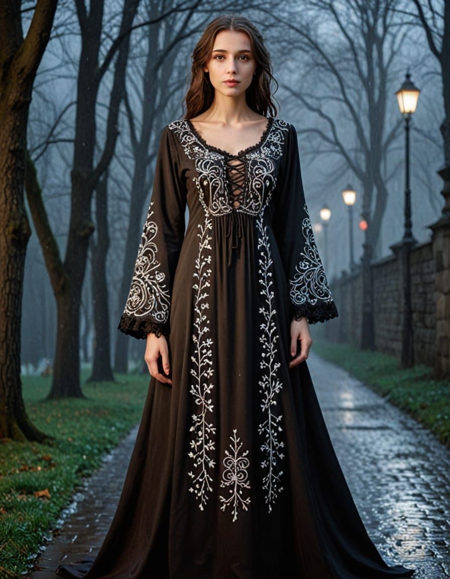 This image depicts a Czech woman wearing a luminous, embroidered gothic nightgown during a winter rain. The artwork evokes a dark fantasy aesthetic.
