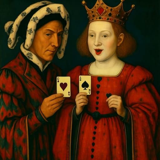 This image depicts a scene of a Queen of Hearts bartering for a pencil, rendered in a style blending Jan van Eyck's detail and Oskar Kokoschka's expressionism.
