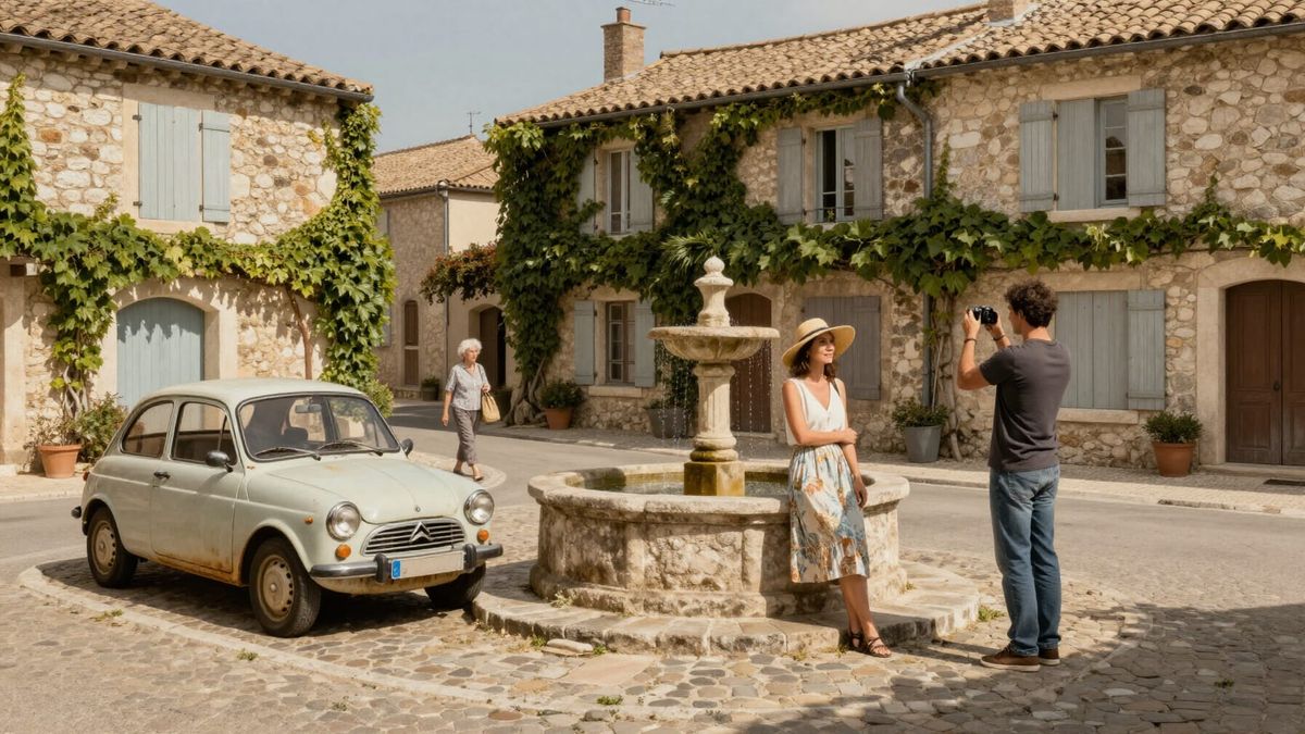 A photorealistic painting of a charming Provencal village scene. Features stone houses, a fountain, cobblestones, a vintage car, and people enjoying a sunny day.