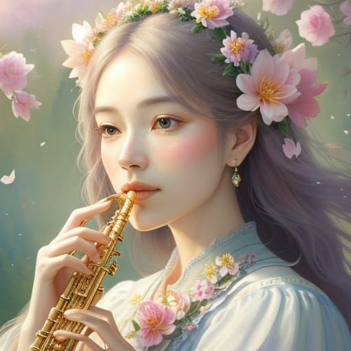 This image shows a close-up portrait of a woman with a flowery face playing the flute. The fantasy art is rendered in a dreamy watercolor style, with soft petals and warm golden lighting.