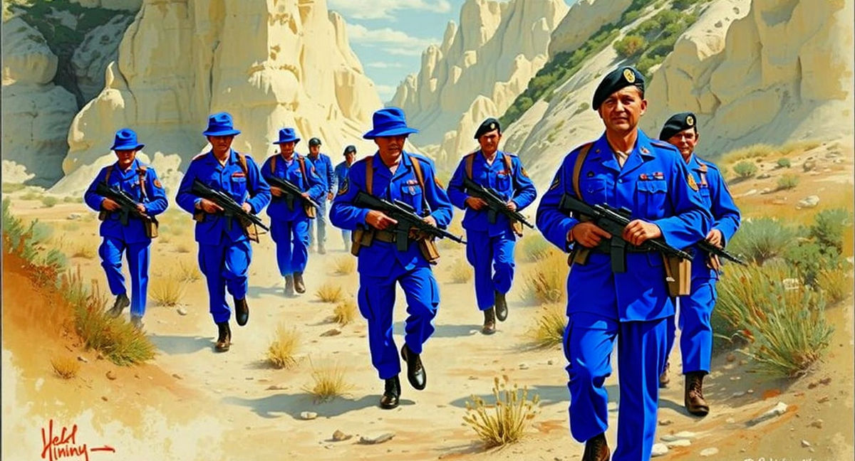 This image captures the stark realism of soldiers patrolling the rugged South Dakota badlands, evoking the documentary style of Don McCullin and the earthy tones of Andrew Wyeth's landscapes.