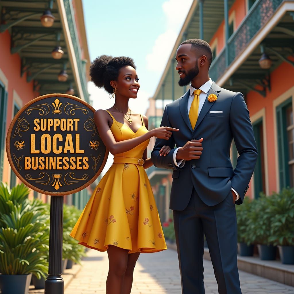 This vibrant image captures the essence of New Orleans' entrepreneurial spirit, with two confident business owners standing proudly beside a 'Support Local Businesses' sign, set against the city's iconic French Quarter backdrop, featuring ornate ironwork, balconies, and lush greenery, with a stunning 3D ...