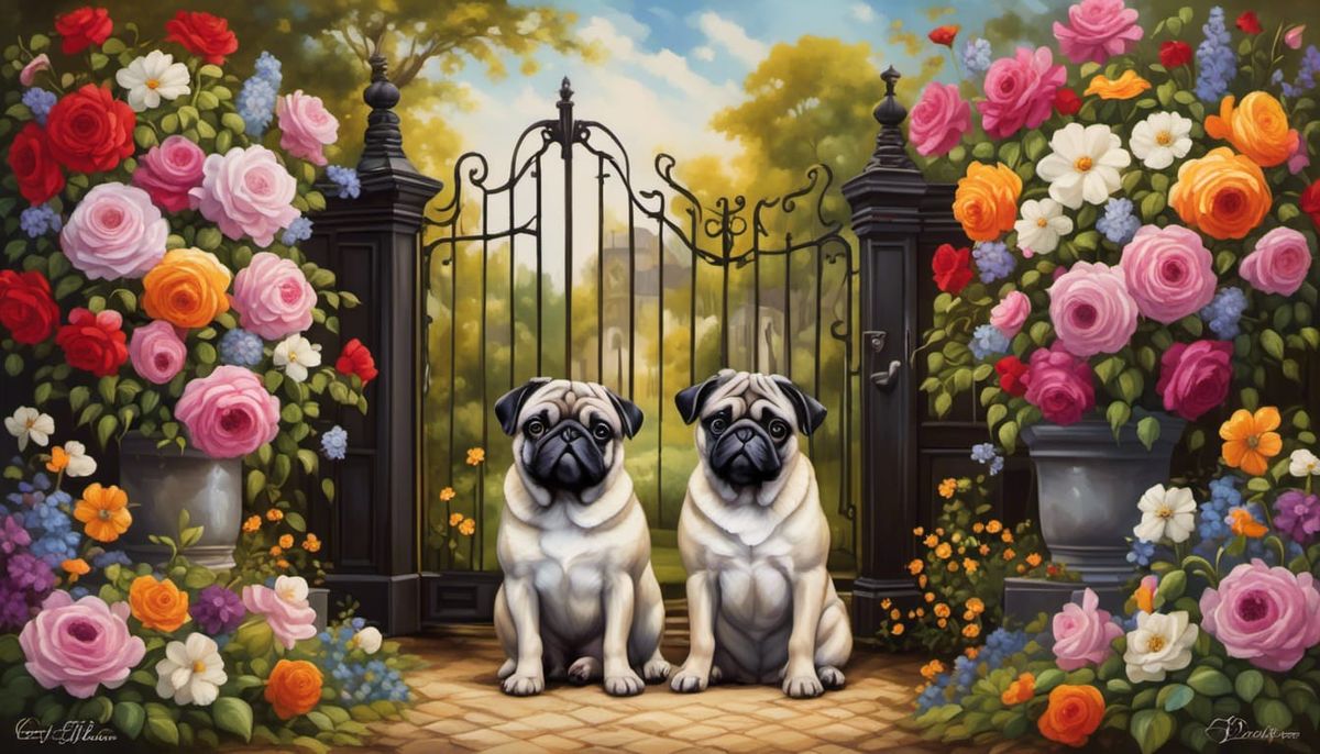 This image shows two pugs at a flower-covered wooden gate. Sunlight dapples the scene, rendered with detailed textures and expressive brushstrokes, evoking the style of 17th-century Dutch masters.