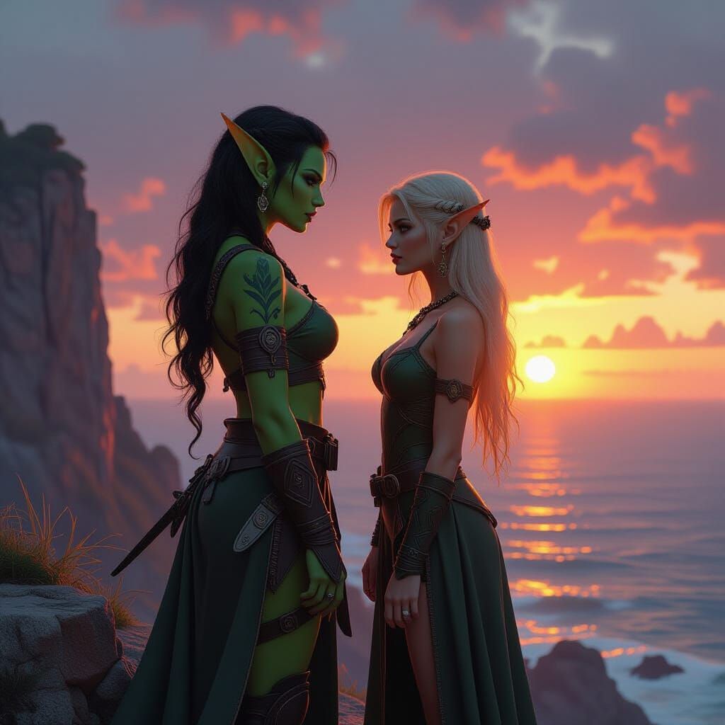This image captures two women, an Amazonian half-orc and an elf, standing on a cliff and observing a vibrant sunset. The scene is rendered in a highly detailed, photorealistic style with realistic lighting and textures.