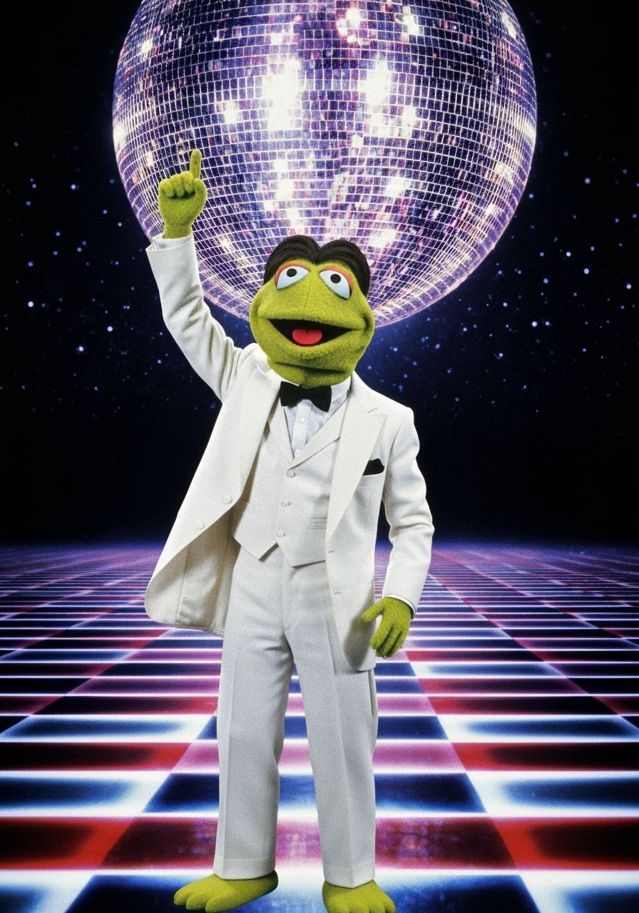 This image shows a parody movie poster featuring Kermit the Frog in John Travolta's iconic pose from Saturday Night Fever. The background includes a glitterball and illuminated checkerboard floor.