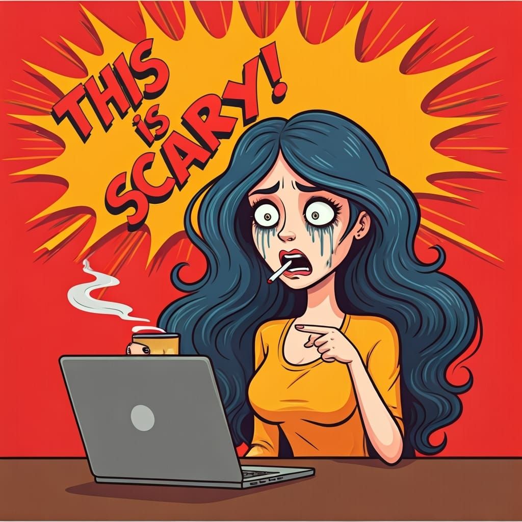 A cartoon woman style of R. CRUMB with long blue hair at a laptop, frightened, with a cigarettes clenched between her teeth and cup of coffee, screaming, mouth shaped like a circle, mascara running down face, with huge bloodshot eyes shaped like circles, frightened eyebrows, dark circles under the eyes, ...