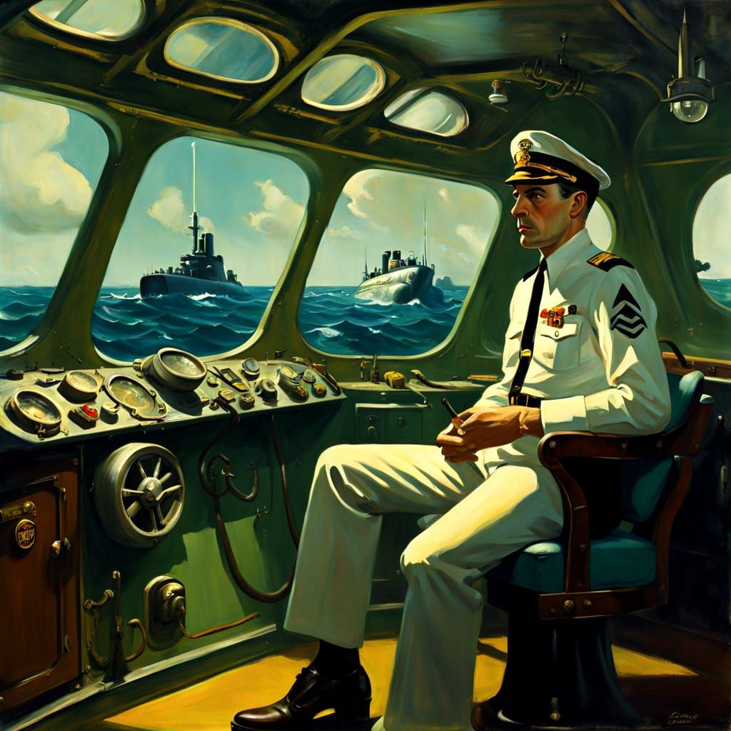 A surreal digital painting of a Dieselpunk submarine captain. The image features gritty textures and vintage elements, creating a dystopian yet magical atmosphere.
