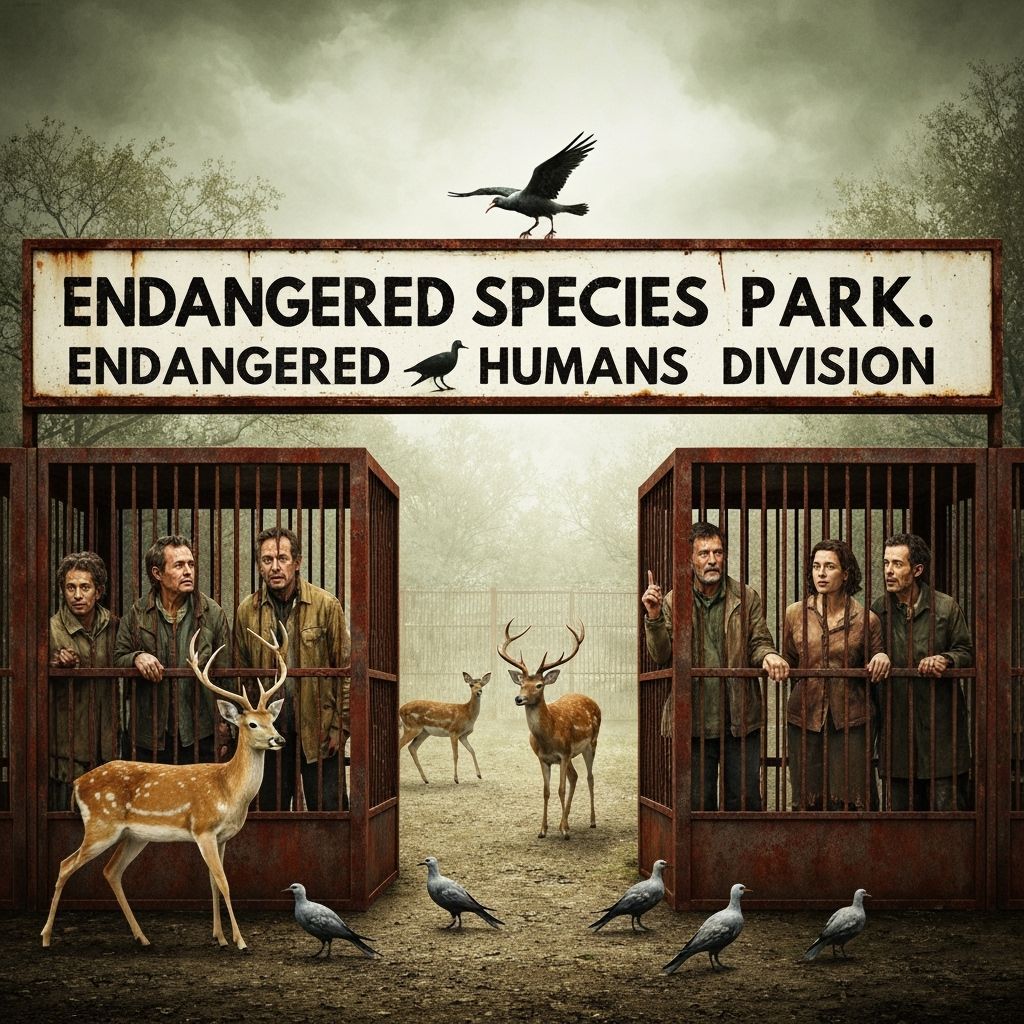 This image shows humans in cages being observed by animals. The artwork features graffiti-style text and a dark, industrial aesthetic, reminiscent of urban street art with satirical elements.