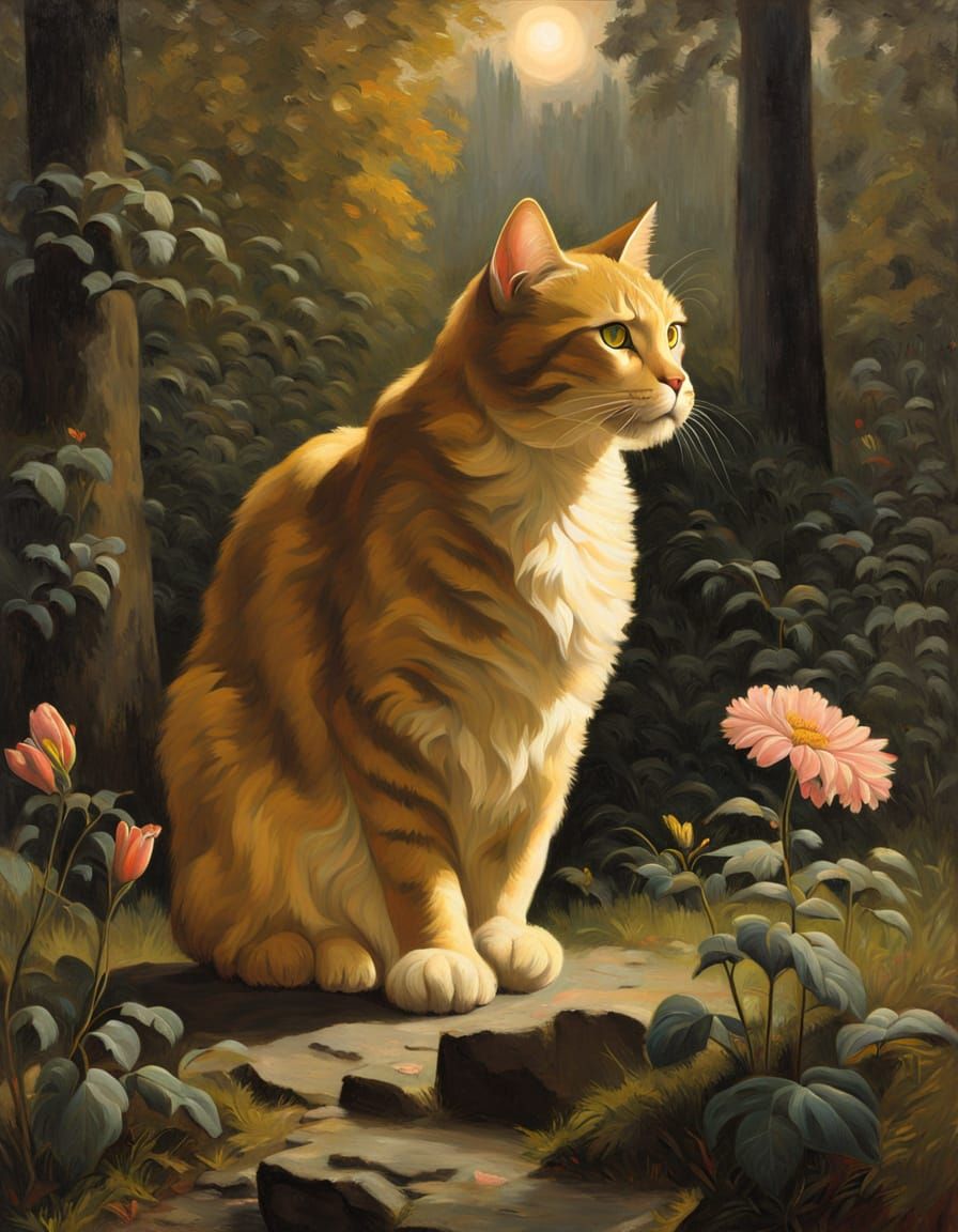 This image shows a powerful cat stalking through a forest, rendered in an Academy-style oil on canvas painting. Fading sunlight casts a somber atmosphere.