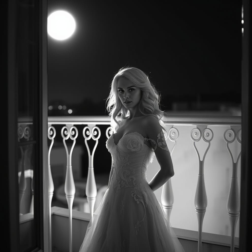A striking picture of a blonde woman on her balcony at night, lit by moonlight. The image is a photorealistic black and white composition with high contrast and delicate grayscale tones, rendered in a classic monochrome style.
