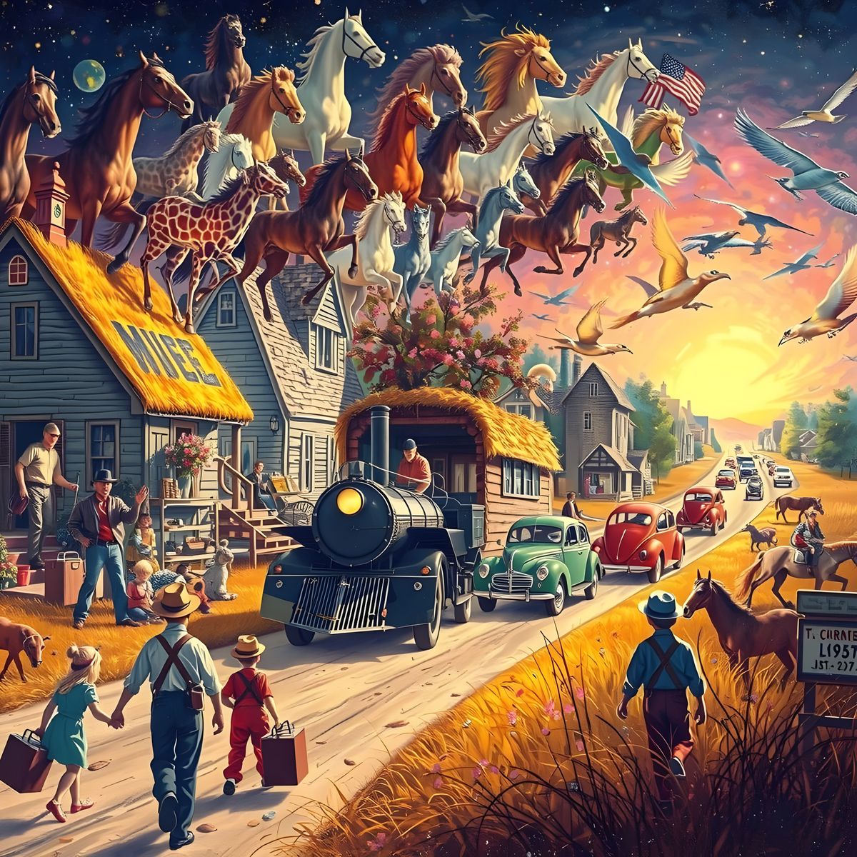 This image presents a mode of transport in the style reminiscent of Norman Rockwell. The artwork evokes a sense of nostalgia through its illustrative style.