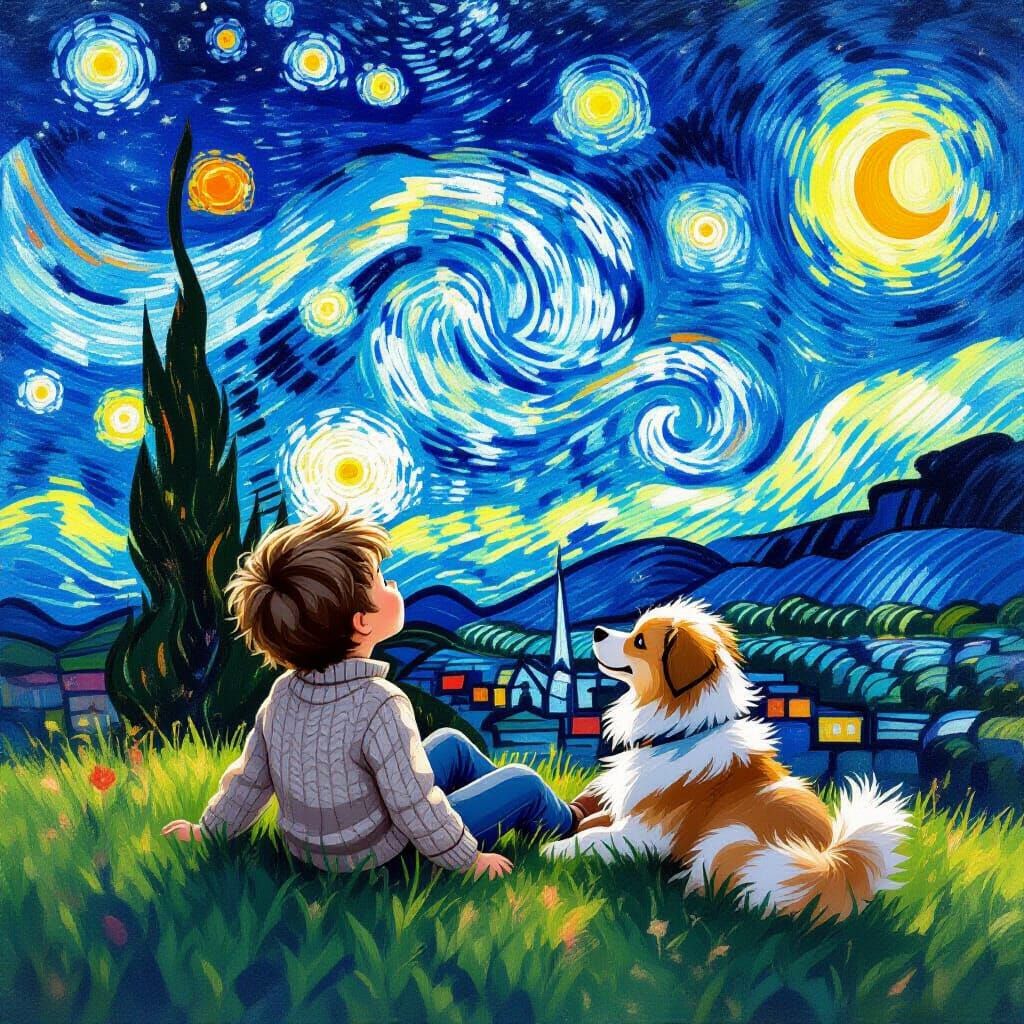 a wonderful cute young boy laying next to his adoreable dog on a meadow and looking un to the magically glittering starry night sky