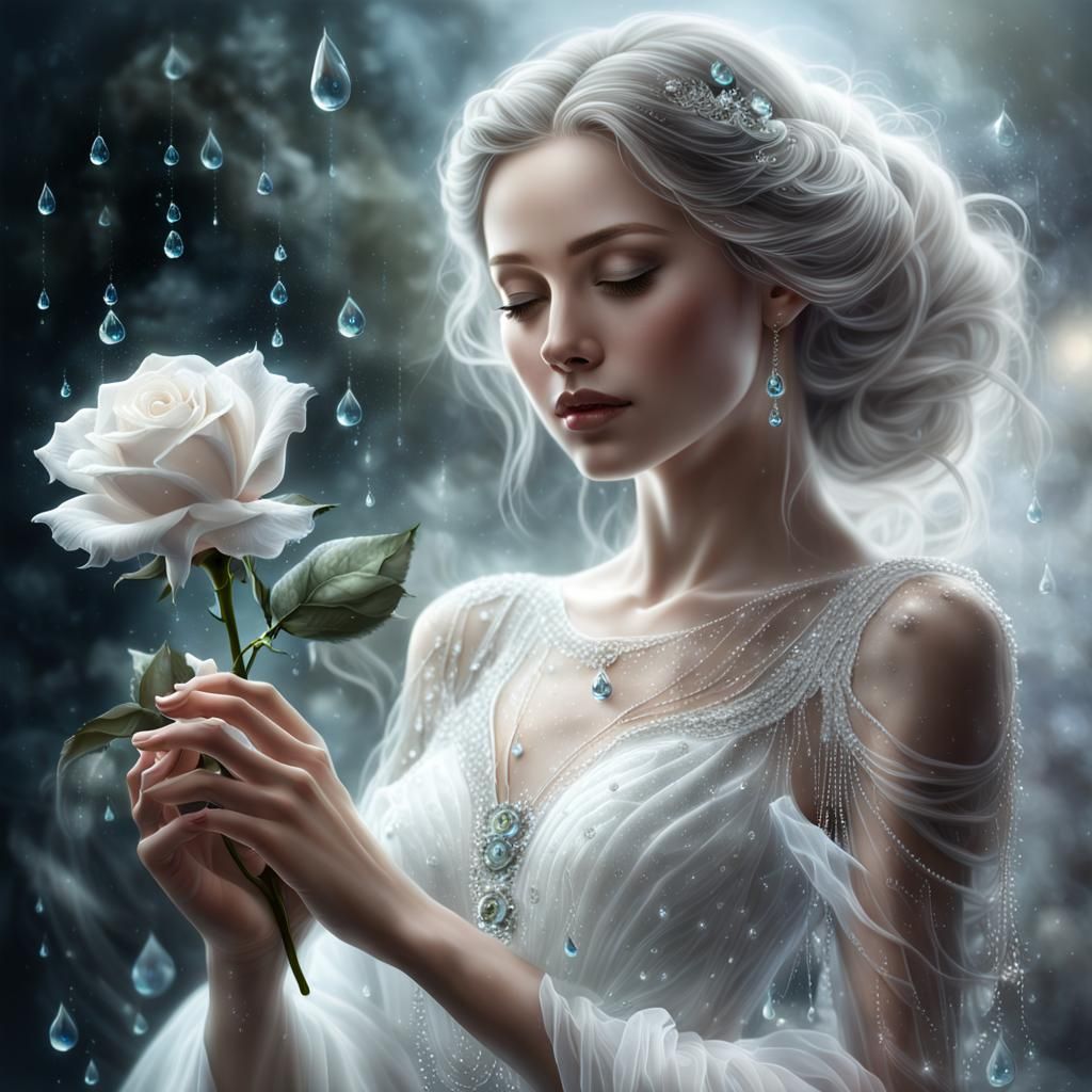 A striking picture of a transparent woman in a flowing white dress, holding a glowing rose. This hyper-realistic digital art features glass-like textures, soft focus, and intricate details, creating an ethereal and delicate aesthetic.