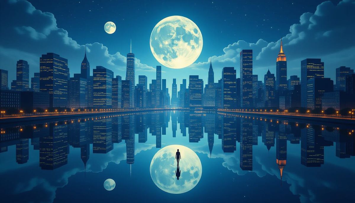 "The Landscape Flipped A vast daytime city skyline mirrored perfectly on a nighttime river — but the water’s reflection shows a surreal alte...