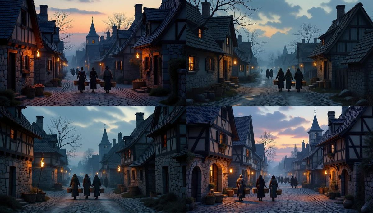 This image depicts a quiet medieval village street at dusk. Villagers with baskets walk slowly as torches cast a faint glow, all rendered in a muted cinematic style.
