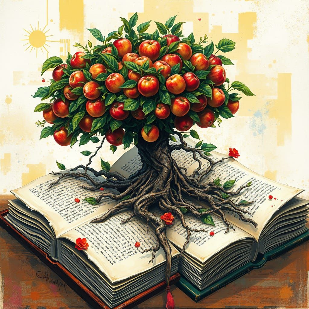 A dreamlike scene of a blooming apple tree bursting forth from a worn book, rendered in high-contrast graffiti and street art style with bold brushstrokes and vivid colors, blending organic textures with digital precision.