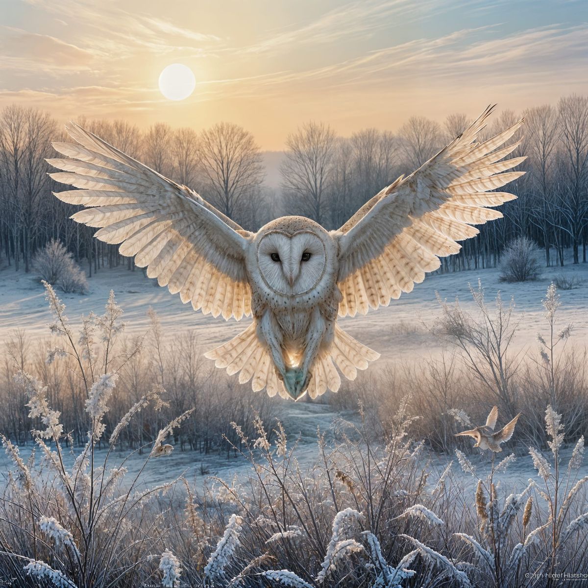 This image depicts a barn owl flying low over a frosted meadow at sunrise. Soft mist rises as a pale sun illuminates the scene with ethereal textures.