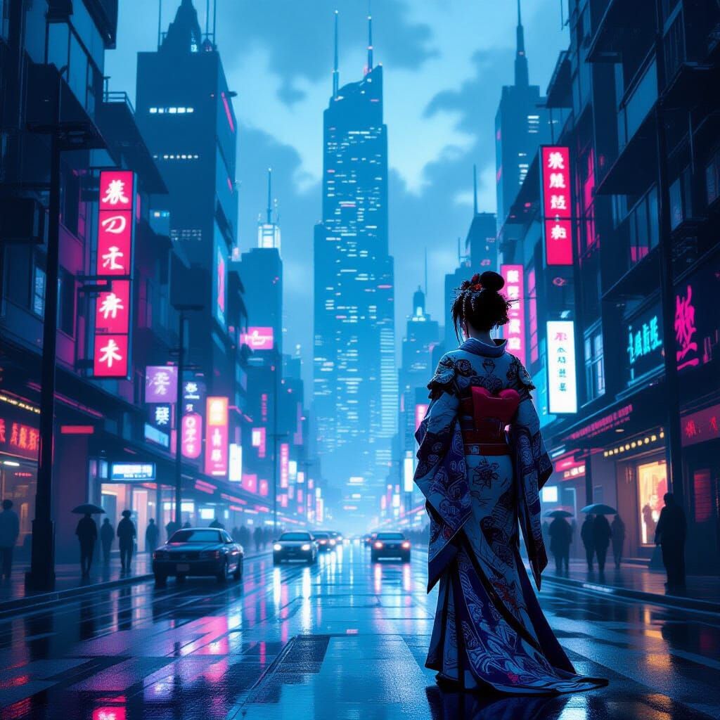 A hyperrealistic digital painting of a lone woman with cybernetics and geisha silks on a rain-slicked, neon street in a dystopian city. Moody lighting and vibrant reflections create a cinematic atmosphere.