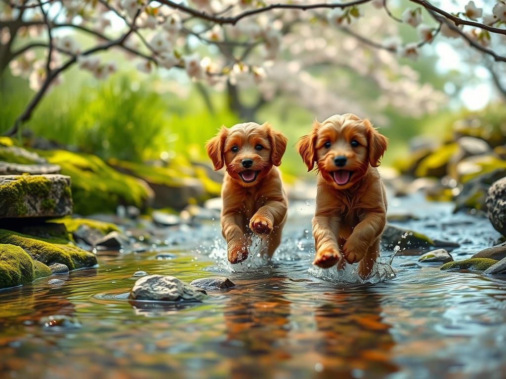 This image shows two wet, red-brown poodle puppies running joyfully through a clear stream. Impressionistic style with dappled sunlight, lush greenery, and cherry blossoms.