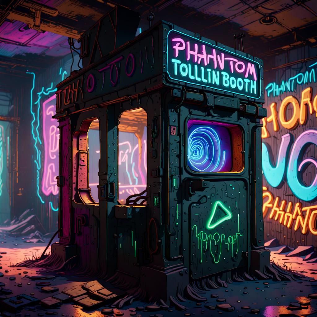 A digital rendering of the phantom tollbooth in a post-apocalyptic setting. The image features neon graffiti and flickering light, rendered in vibrant colors with an ethereal quality.
