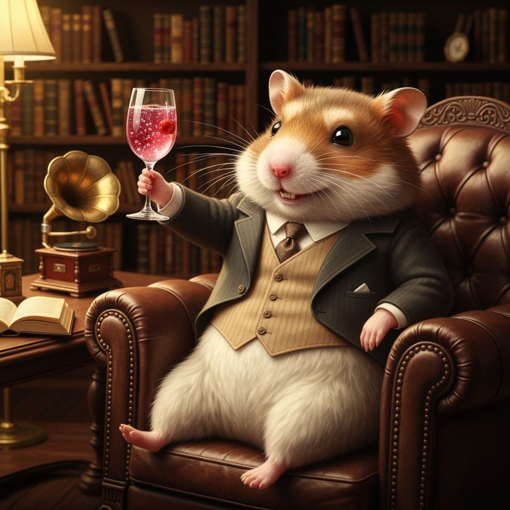 A retro hamster dressed as a 1920s gentleman sits in a luxurious leather armchair inside an elegant library filled with tiny antique books and a vintage gramophone on the table. He raises a glass of sparkling cherry lemonade in a toast — 'To your health!', the bubbles and reflections rendered in ultra-detailed clarity. His eyes meet the viewer's gaze with a charming, knowing smile, full of wit and warmth. One paw delicately holds the glass, the other rests casually on the armrest. The atmosphere is warm and glamorous, styled like an Art Deco illustration with golden tones, rich textures, and intricate detailing of fur, leather, and wood. Soft ambient light highlights the fine whiskers and polished surfaces. Rendered in 8K resolution."