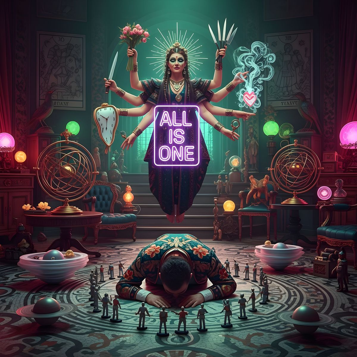 This image shows a multi-armed goddess floating in an opulent salon. A man kneels before her as toy soldiers orbit them. The scene is captured with over-saturated pastel colors and mixed lighting.