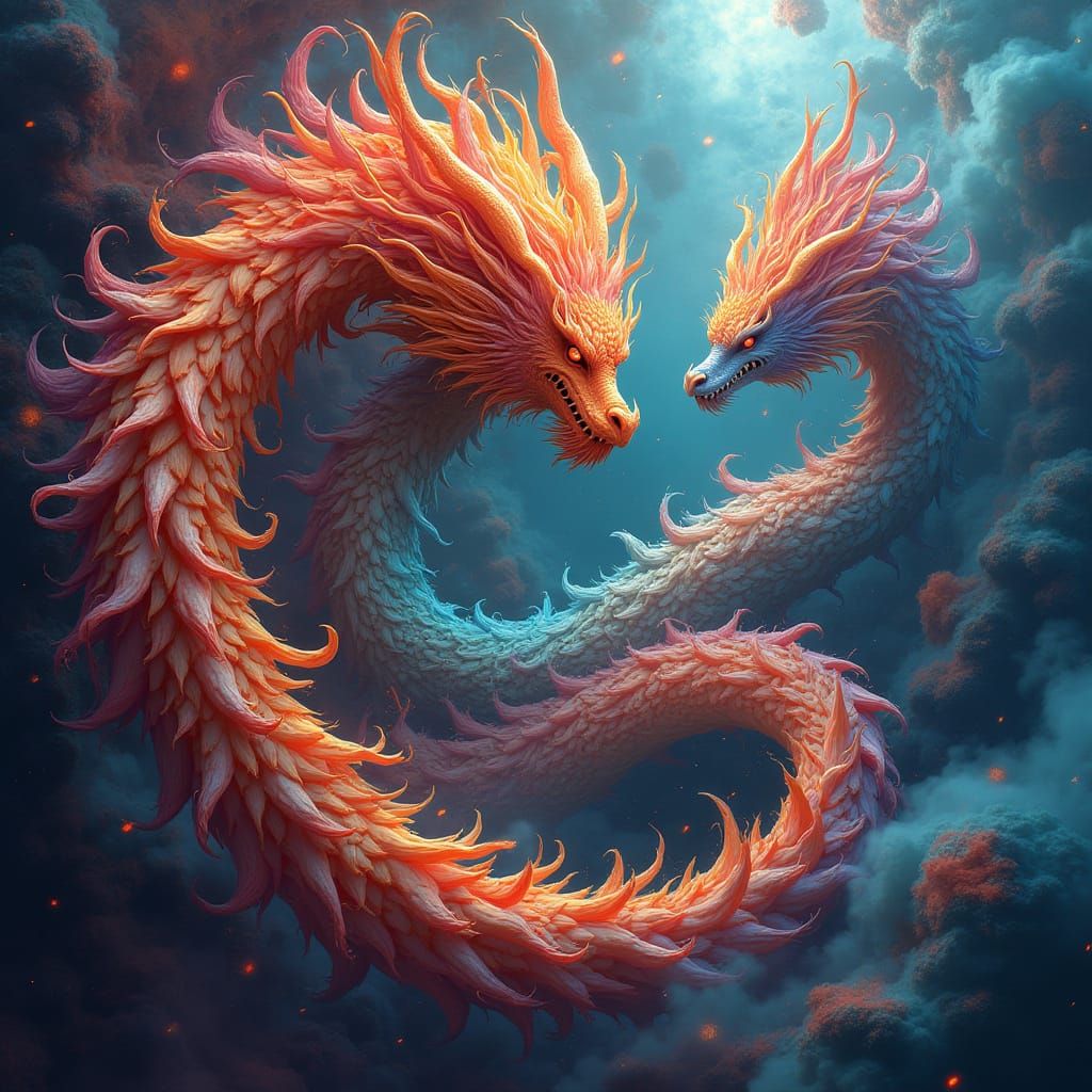 A vibrant, swirling pattern with hidden shapes and colors and transform into dragon-like creatures that appear to jump out detailed matte painting, deep color, fantastical, intricate detail, splash screen, complementary colors, fantasy concept art, 8k resolution trending on Artstation Unreal Engine ...