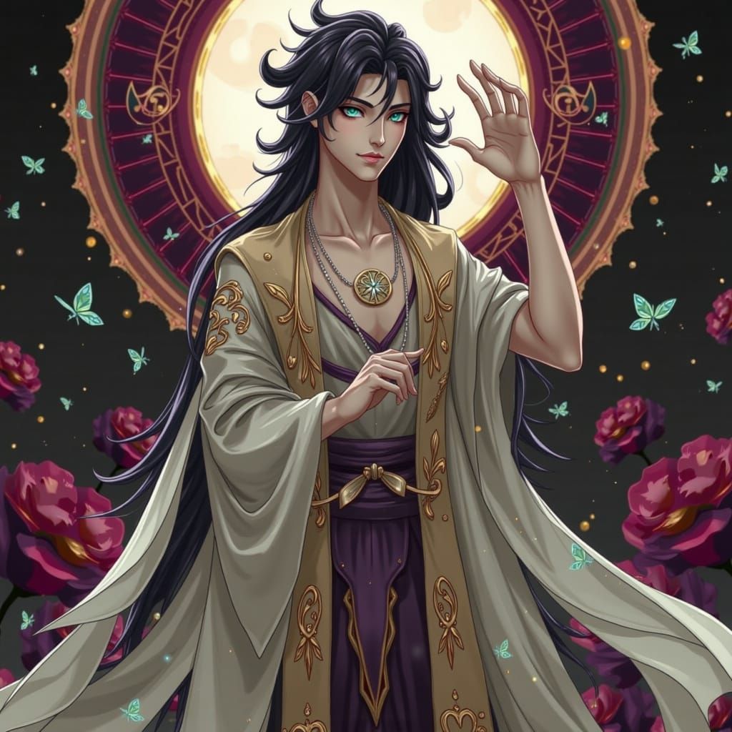 This image shows a majestic cultivator with rich purple hair and striking teal eyes, evoking the fantastical worlds of Japanese manga and dreamlike quality of watercolor art, with intricate patterns and motifs adorning his flowing robes.