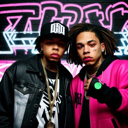 A vibrant street art portrait of rappers Lil Bow Wow and Big Latto. The close-up shot features bright, neon colors, graffiti tags, and flashing jewelry, capturing the high energy of the music industry.