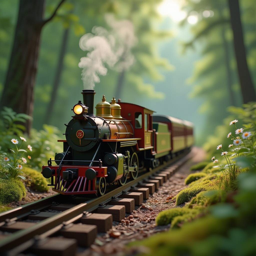 This image shows a weathered, vintage toy train on a mossy track in an overgrown forest. Hyperrealistic style with cinematic lighting creates a nostalgic atmosphere of lost adventures.