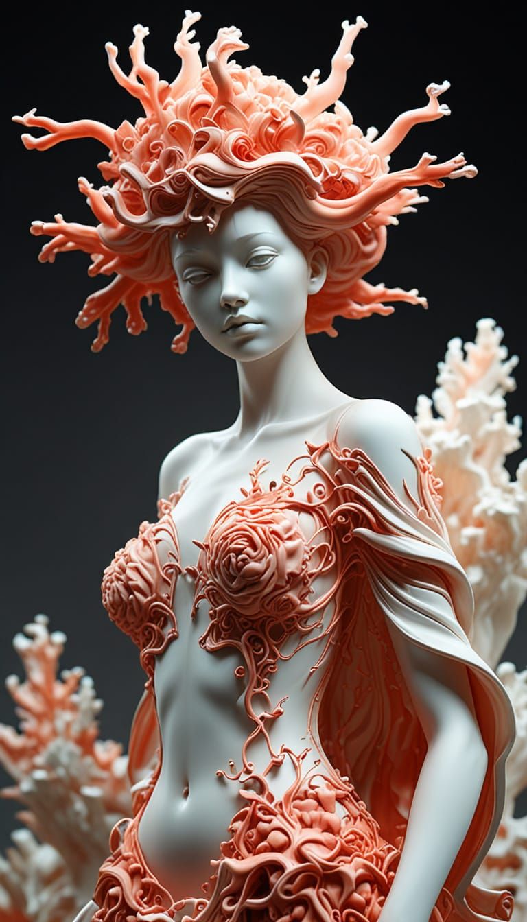 This image shows an abstract sculpture with coral and alabaster elements. The surreal composition features dreamlike dye-transfer art, smooth textures, and a soft, pastel color scheme. The artwork is highly detailed in a surrealist style.