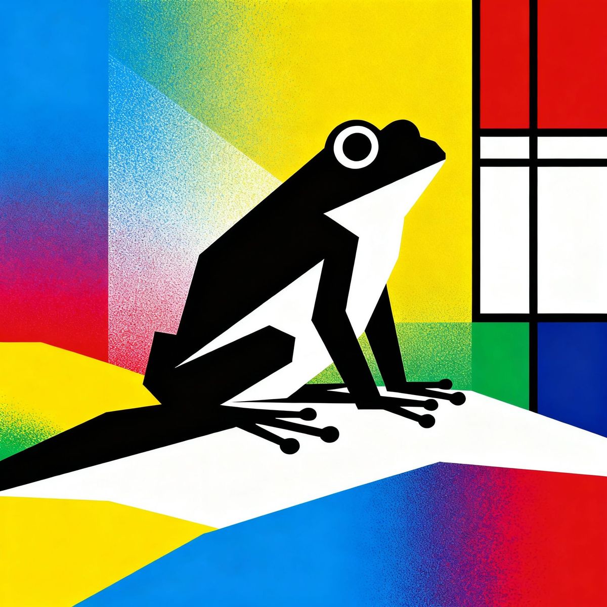 This image features a stylized geometric frog with sharp shapes and bold colors on a minimalist abstract landscape. The artwork has a modern abstract feel with pop art influences and a flat, graphic quality.