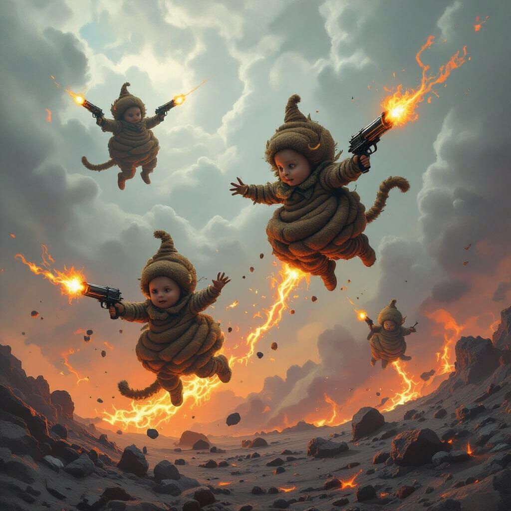 This image depicts whimsical, child-like creatures made of swirling matter, flying through a volcanic sky. The surreal scene features intense weather and glowing weapons, rendered in a dark fantasy style.