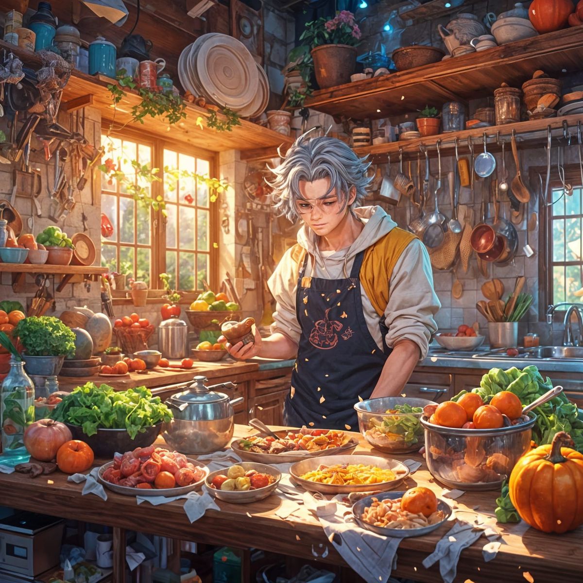 This image depicts a man navigating his quarter-life crisis, focusing on cooking and health while saving money. The artwork evokes a cel-shaded anime style with deep colors and cinematic lighting.