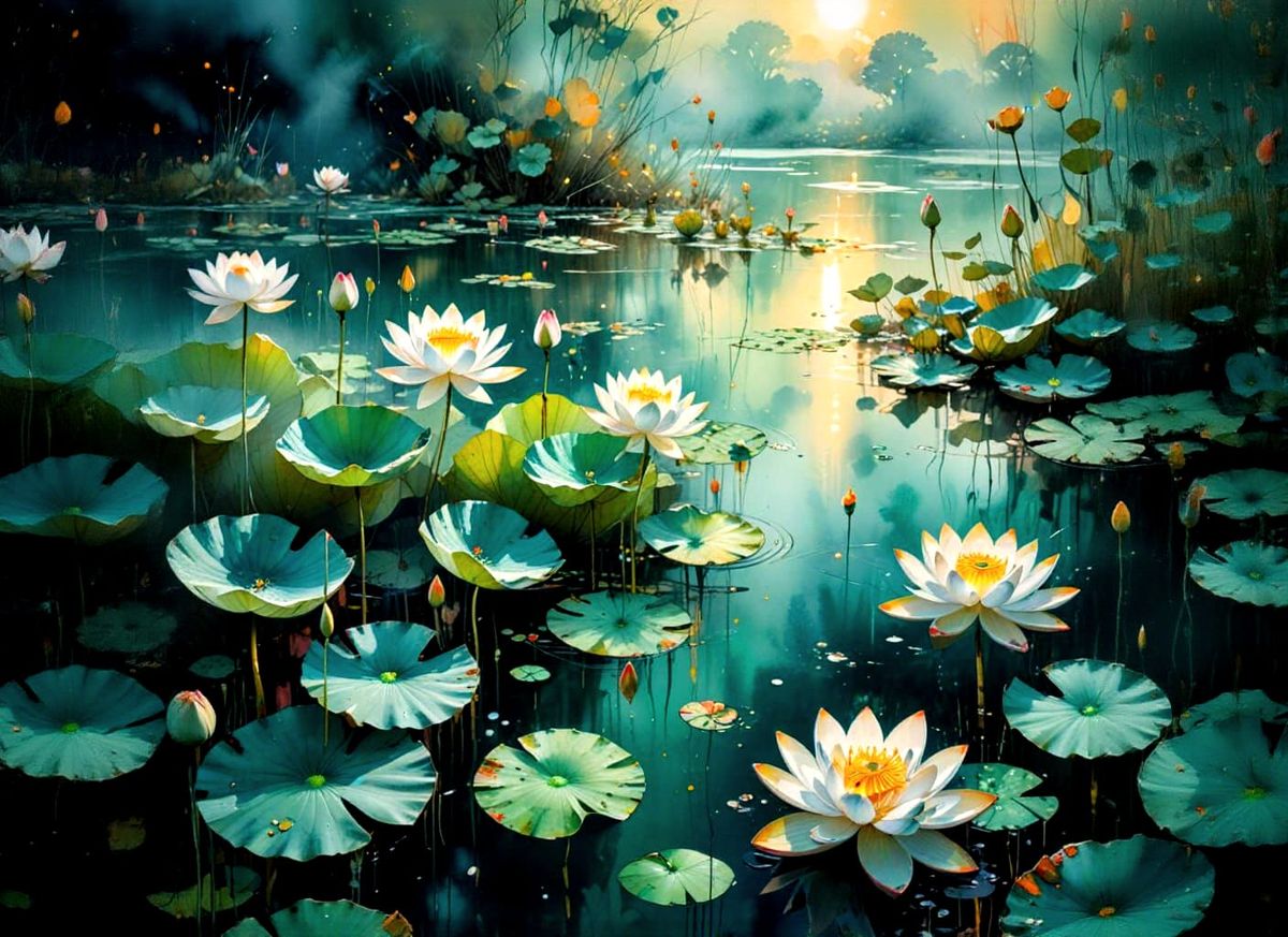 This serene watercolour painting depicts a small lake teeming with lotus flowers, surrounded by the mystical atmosphere of a forest. Soft, ethereal light filters through the canopy, creating a dreamlike ambiance.