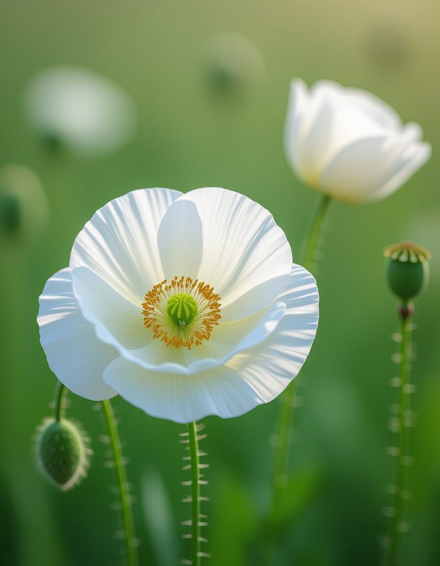 This image shows a detailed close-up of a white poppy with a bud in a field. The delicate petals and green stems are set against a soft, blurred background.