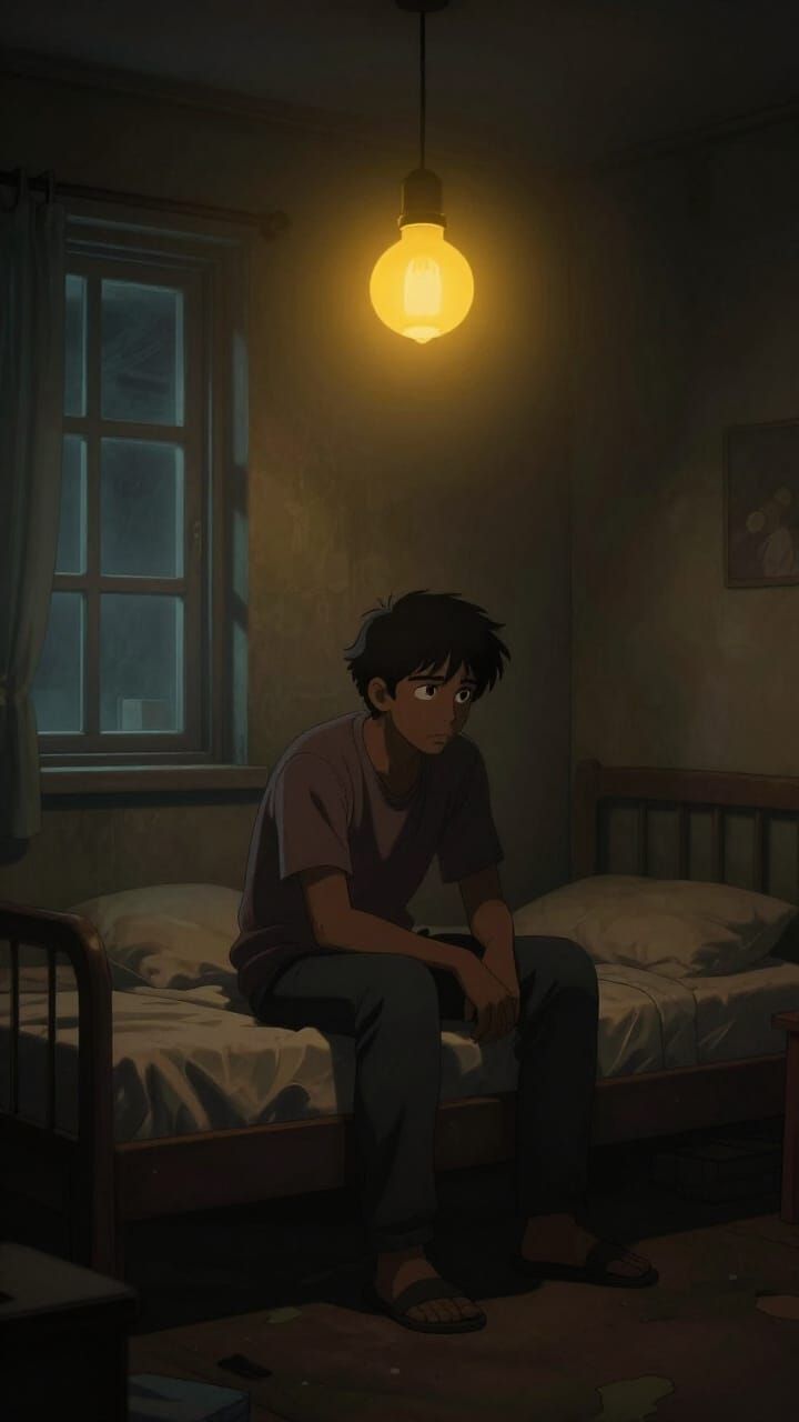 This image shows a dark room with a dim bulb, featuring Raghav with a worried look. Animated cinematic horror style with soft fog and low light creates an eerie atmosphere.