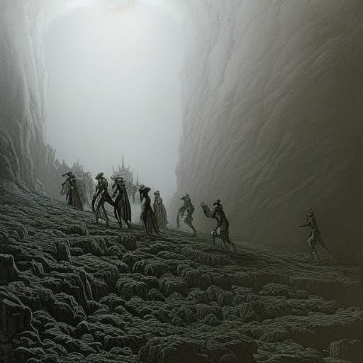 This image shows a brightly colored and chaotic scene in neon lights. The artwork evokes a dark and dramatic style reminiscent of gothic horror art.