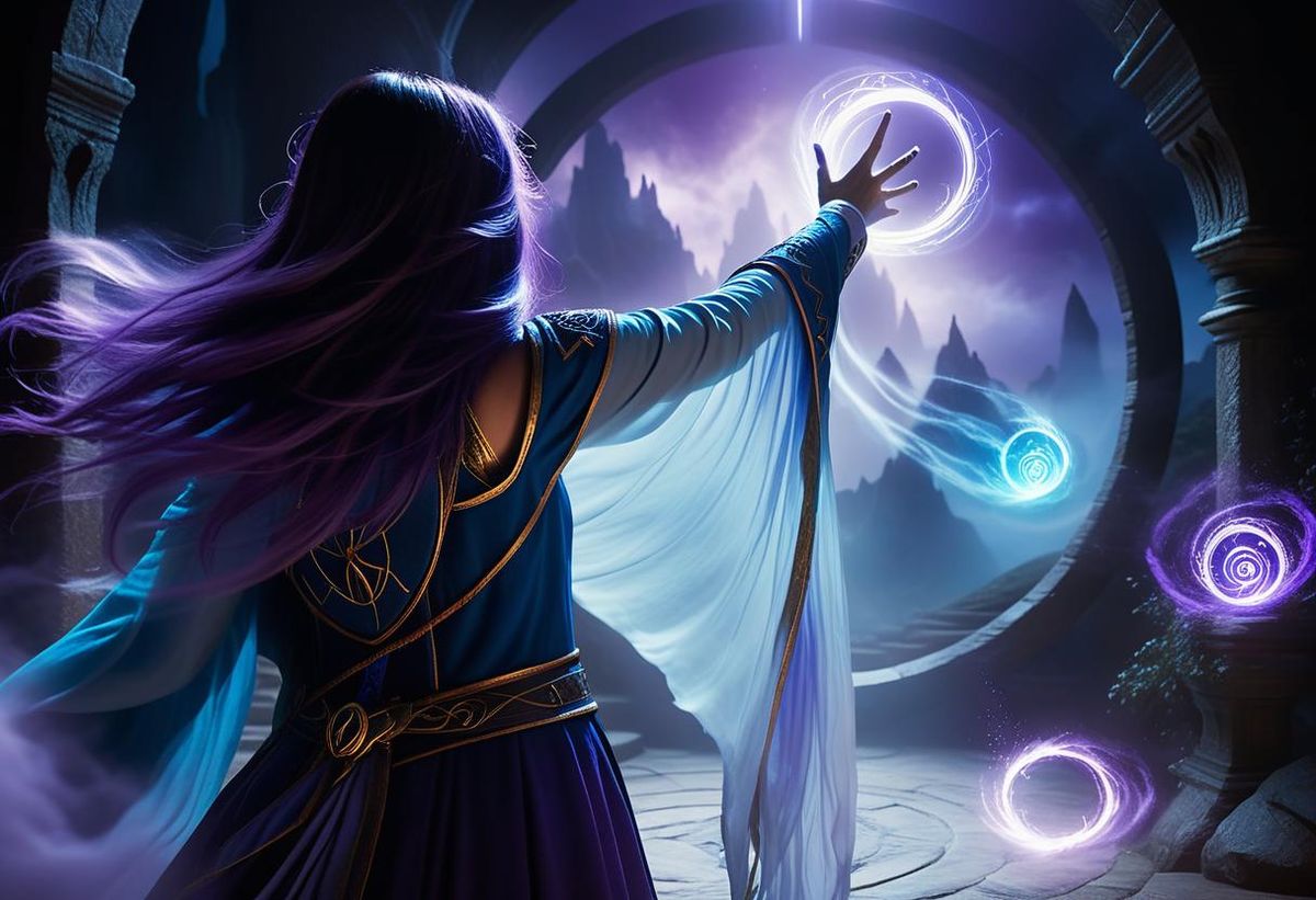 This image shows a female sorcerer from behind, creating a magical portal. Swirling runes and soft mist surround the portal in deep blues and violets, in a cinematic fantasy illustration.