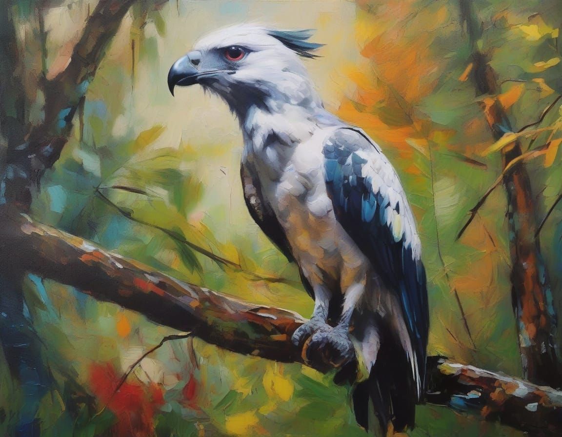 A vibrant, neo-expressionist acrylic painting of a Harpy Eagle in a lush rainforest, characterized by thick impasto layers, fauvist colors, and intricate details, capturing dramatic lighting and textured 3D depth.