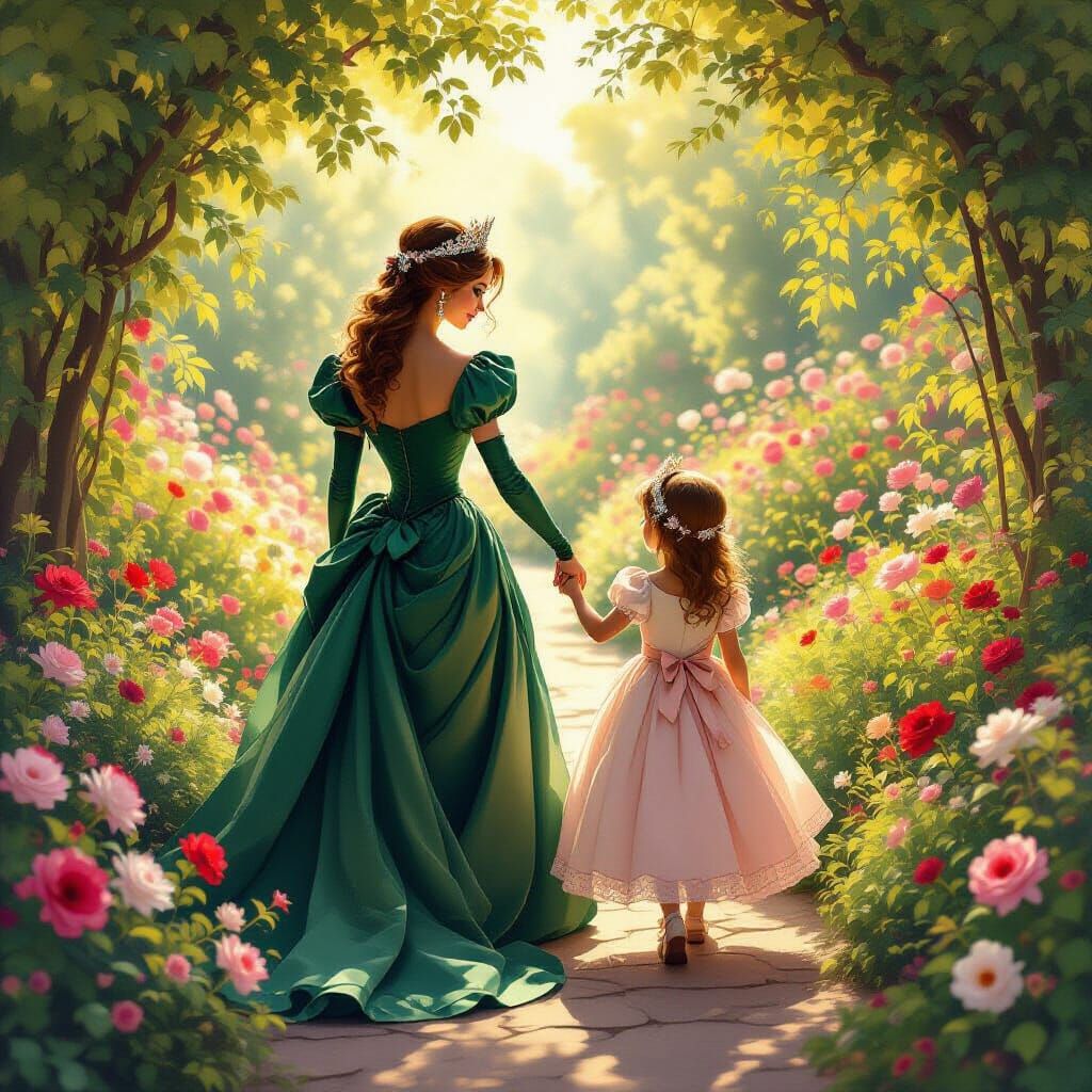 This image shows a queen and princess in elegant gowns walking hand-in-hand through a vibrant, sunlit flower garden. Rendered in a luminous storybook illustration style with Art Nouveau influences.