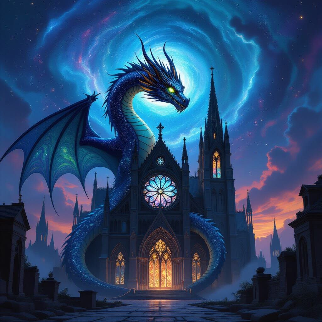 A striking picture of a bioluminescent dragon coiled around a ruined cathedral. Cosmic dust drapes the dragon, set against a swirling nebula backdrop, with stained-glass patterns casting an eerie glow in a dark fantasy style.